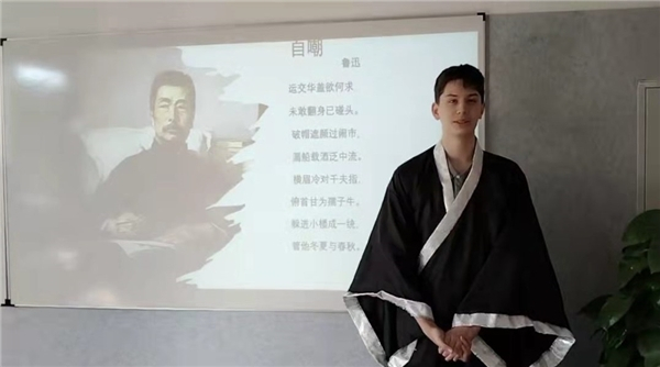 Oliver和Fabien两位外籍同学,选择诗歌朗诵这种方式纪念鲁迅先生。他们用充沛的情感,以富有内涵的有声语言,表达了自己对鲁迅先生的敬意,刻画了作者宽广、深邃的内心世界,以及深层的哲理思考。