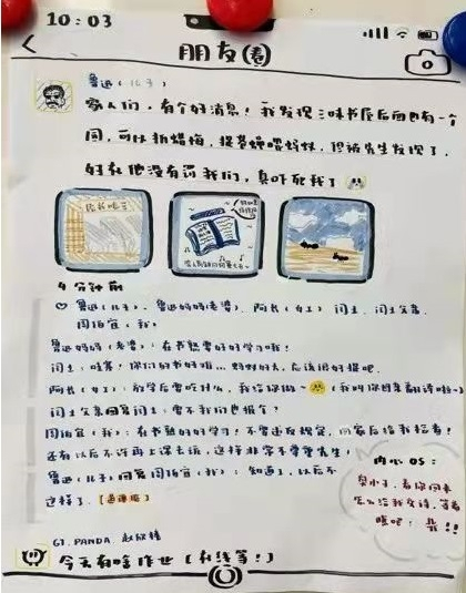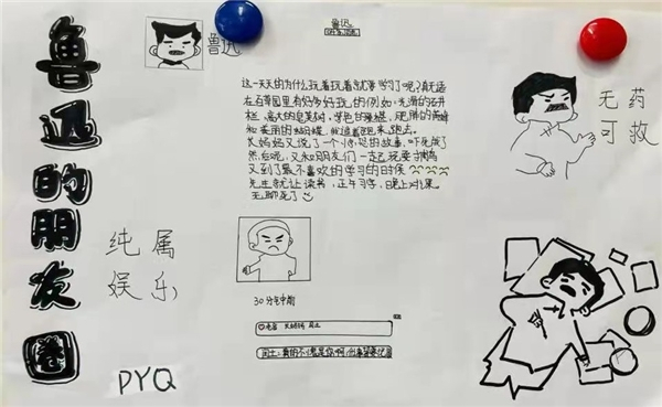 脑洞大开的“鲁迅朋友圈大揭秘”,是同学们天马行空的想象。在“朋友圈”里,鲁迅不再是距离遥远的大作家,而是一个调皮的少年。他会发布新发现的乐园,招呼小伙伴快来玩;他是一心想上树摘果子吃的贪吃鬼,告诉大家果子好不好吃;他也是一个吐槽老师作业留太多的顽皮boy。