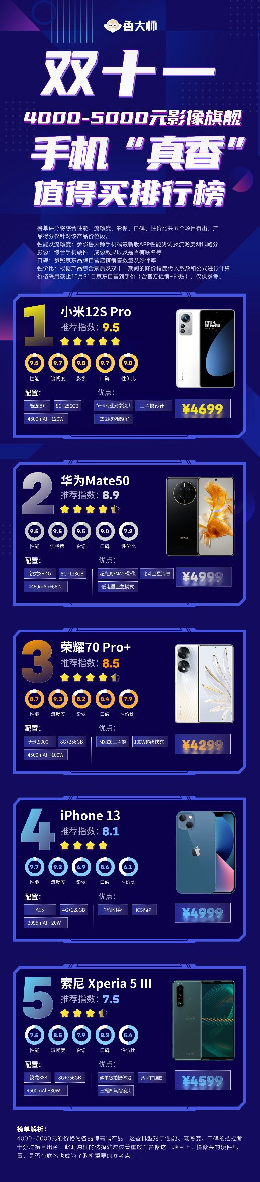 上一个价位段的各款机型在性能上基本都拉满了,4-5K这个价位段各个品牌们也都开始着眼于影像旗舰,这个价位的机型我们选了小米12s Pro、华为Mate50、荣耀70 Pro+、iPhone 13、索尼 Xperia 5 III。