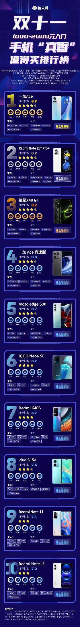 最后让我们来总结一下。2000元以下段位,是以一加Ace和Redmi Note 11T Pro+为代表的极具性价比的千元级入门机,它们往往有一些偏科;2000~3000元,是以iQOO Neo7、Redmi K50至尊版为代表的在性能上较为突出,综合配置也有亮点的机型,适合学生党选择;3000~4000元则是以小米12S、vivo X80这类具有差异化的主流旗舰机型,可以根据自己的需求选择;4000~5000元的机型们基本都着重于影像,可以选择小米12S Pro、华为Mate50这样在影像上有亮点的机型;而7000+元就是小米MIX Fold2、华为Mate50 Pro这样的机型,更适合商务人士选择。