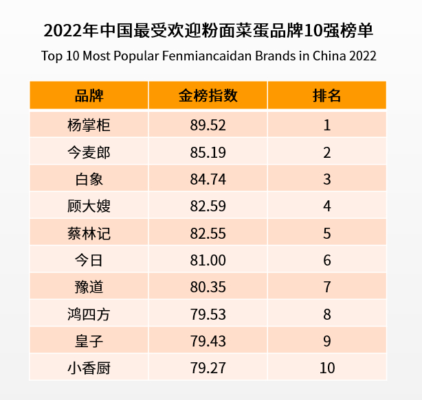 同时,在iiMedia Ranking(艾媒金榜)最新发布《2022年中国最受欢迎粉面菜蛋品牌10强榜单》中显示 ,2022年中国粉面菜蛋品牌的榜单中,杨掌柜以89.52分,排名第一。