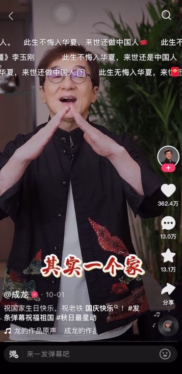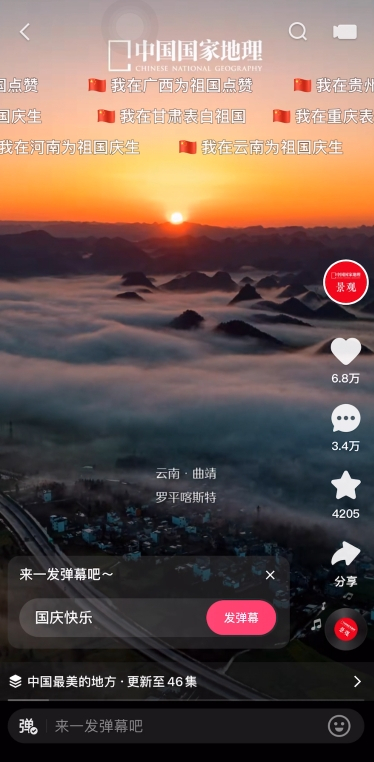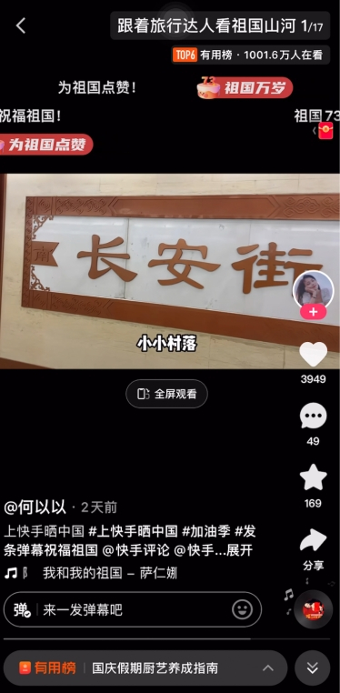 而快手在国庆期间推出的弹幕活动则吸引了四川观察、环球网等20个媒体号以及成龙、朗朗、蔡明、谢娜等21位明星,旅游、摄影、情感、二次元、舞蹈、颜值、音乐等垂类66个大V共同参与。在@中国地理景观 发布的《中国人的家园》短视频中,各地美景共同拼出一幅祖国的锦绣山河图,多地用户以“报地名”的方式,纷纷发送带有小红旗的弹幕表白祖国;@成龙 发布的翻唱歌曲《国家》短视频中,刷屏的弹幕“此生无悔入华夏,来生还做中国人”则展现了家国情怀;旅行达人@何以以 的视频里,用户一道“云”看天安门广场,以“祖国万岁”“为祖国点赞”的特殊弹幕表达出心中的自豪和热爱。