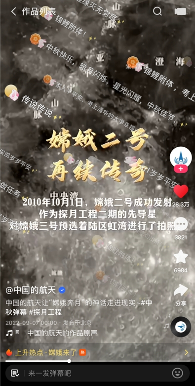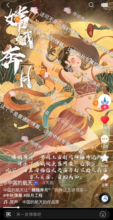 除了以多样的弹幕玩法吸引平台用户自发积极互动,站内媒体号、明星和多个垂类大V也参与其中。中秋期间,在中国航天局官方账号“中国的航天”发布的嫦娥号探月视频中,十几万网友使用“玉兔版弹幕”留言,一条条飘过的弹幕好似被放飞的愿望,伴随嫦娥号一同奔向月亮。