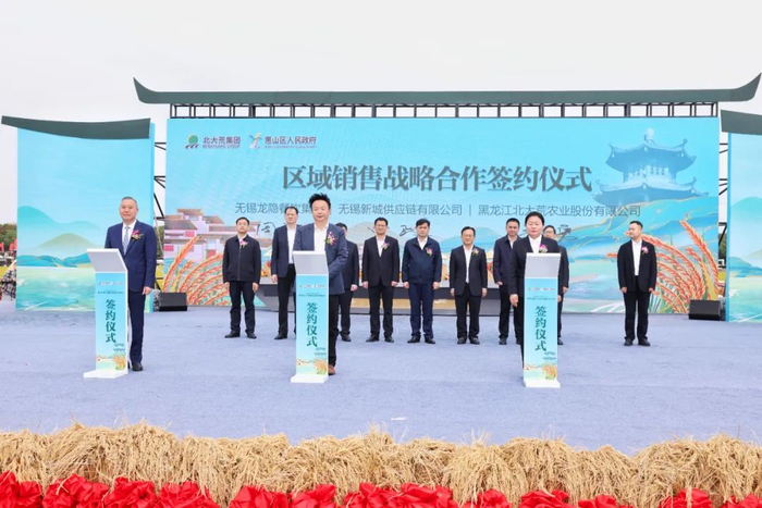 无锡龙隐餐饮集团、无锡新城供应链有限公司、黑龙江北大荒农业股份有限公司代表签署区域销售战略合作;