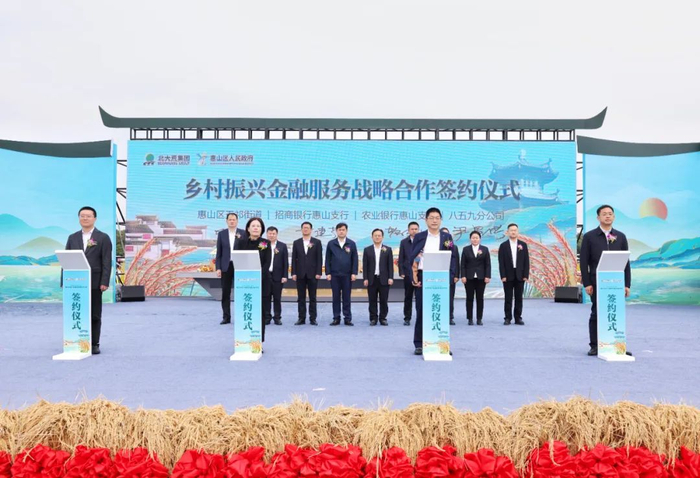 现场惠山区玉祁街道、招商银行惠山支行、农业银行惠山支行与北大荒集团黑龙江八五九农场有限公司党委书记、黑龙江北大荒农业股份有限公司八五九分公司总经理尹显洪签署乡村振兴金融服务战略合作;