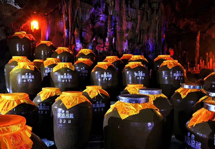 美酒洞位于仁怀市茅台镇梅子坳村,此洞直径深度将近200米,内部结构典型的喀斯特地貌形成的天然溶洞,洞内常年恒温(14°C至17°C)温度适宜(80%至90%)。是洞藏美酒的绝佳之地。天然美酒洞内常年恒温,湿度适宜,空气中微生物种类丰富,对原酒的保存和后天的老熟、生香,具有独特的作用。茅台镇的酒为什么特点鲜明被市场认可, 跟茅台镇本地的小红粮,还有独有的发酵细菌群有很大关系,在洞内的石壁上,鲜明的长着很多梅花状的菌,那是长年累月所积累的,在天然溶洞是恒温恒湿而年代久远的洞穴更是有着不可多得的天然微生物群,在这个状态下,酒的陈酿老熟的过程是缓慢、均匀完成的。一些杂质和有害物质就被释放、挥发出去。酒密封保疗在山洞,时间一长,就形成一个自然封闭的微生物环境,这个微生物的环境又反作用给酒体,使酒在自然静态的环境中自然升华。