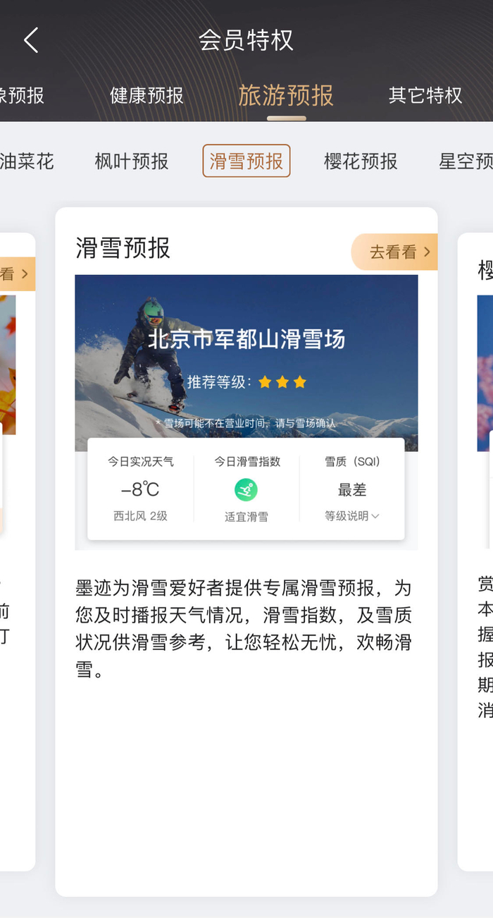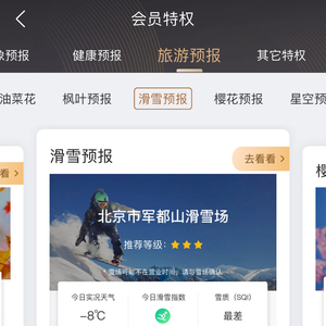 除此之外,还有一些专门为不同人群提供的特色预报。例如滑雪爱好者可以通过“滑雪预报”获得专属预报,哪些滑雪场最受关注?周边哪里的雪场最好玩?当天的天气情况、滑雪指数、雪质状况等信息都可以获得参考,保障用户滑雪安全尽兴。