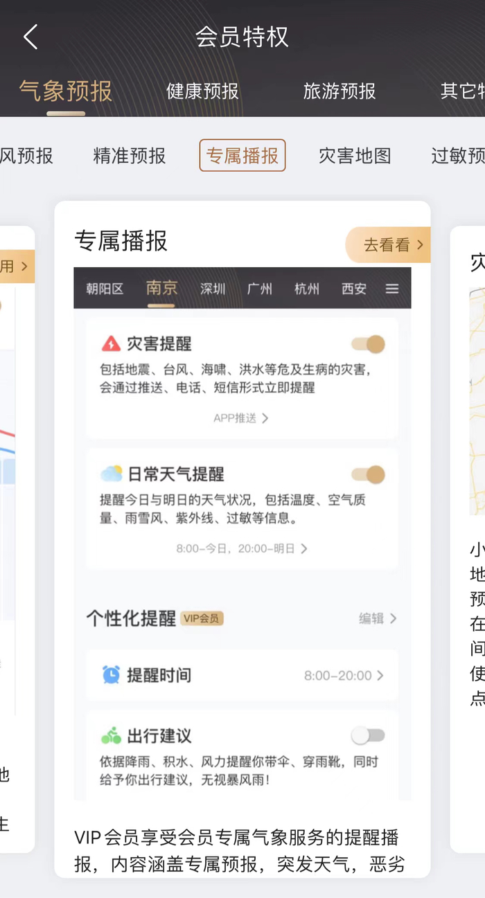 墨迹天气的会员权益中,有一项专属播报功能。用户可以自主设置接收提醒的时间和内容。如选择在什么时间段接收灾害、日常天气提醒或是出行建议,这样个性化的信息获取方式,大大减少了用户的操作步骤,却无形中增加了应用的用户粘性。