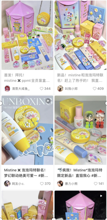 本次Mistine蜜丝婷X泡泡玛特PINO JELLY的联名PR礼盒在抖音、小红书等多平台也引发了一股不小的讨论风潮。独特、有趣的包装设计十分契合年轻人对新、奇、特的追求,治愈的潮玩、萌趣的互动装置,成功吸引各圈层年轻人的关注。