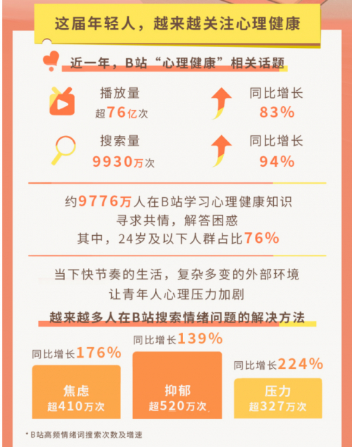 不久前,B站发布的“2022 bilibili 青年心理健康报告”显示,超3400万人在B站观看过个人成长类心理视频,《2021心理健康行业年度报告》统计也显示,我国大约有73.6%以上的人处于心理亚健康状态,18-25岁以下年轻人焦虑水平明显高于其他年龄段。