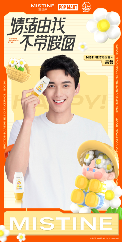 为了传递“情绪由我 不带假面”的活动主题,Mistine蜜丝婷X泡泡玛特PINO JELLY携手明星及KOL发布态度KV,将防晒代言人吴磊的“活力开心”,底妆代言人鞠婧祎的“元气与热爱”,以及Mistine蜜丝婷泰美体验官张楚寒的“我的快乐只能由我定义”、宵夜的“叛逆自由无所畏惧”、哈搜的“坚持热爱”,与开心HAPPY、叛逆BOOM 和 LOVE热爱三只潮玩公仔性格相呼应,照出了年轻人们多面的人生与态度,不管是酣畅淋漓的外向释放,还是隐忍克制的内向含蓄,都是自己的专属表达!