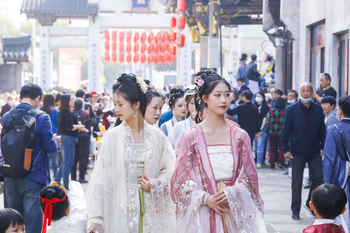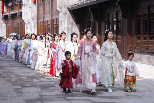 当“杭州宋韵”遇见“新昌文脉”。从“宋韵之都”杭州吹来一阵文艺国风,由50位杭州专业国风文化使者在新昌老台门文化建筑遗迹里呈现一场“国风美学汉服霓裳秀”。青砖黛瓦,小桥流水,曲裾轻舞,文化使者身着汉服衣袂,飘然穿过历史古街,行走于古城墙与亭台楼榭间,一步入画卷,一梦回千年。