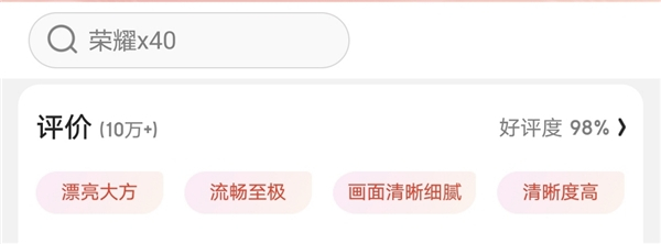 荣耀X40开售以来收获各界诸多好评,在荣耀京东自营旗舰店,评价量突破10W+,好评率高达98%。而媒体也评价到,“完全可以闭眼入”、“满足更多群体的用机需求”、“带来不一样的视界”……不难看出,荣耀X40获得了销量与口碑的双丰收。