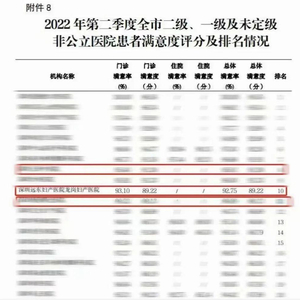 深圳卫健委公布了2022年第二季度我市医疗行业服务患者满意度调查结果,我院在全市非公医院中继第一季度位列全市第十名之后,再次排名靠前,稳居第十位。