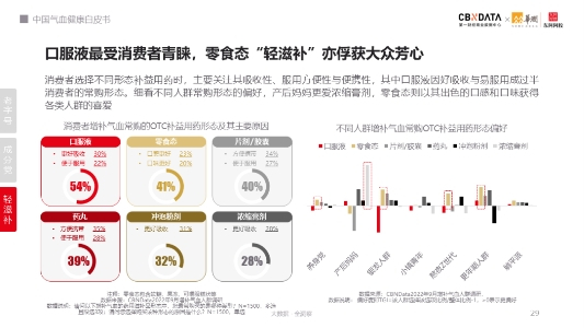 《白皮书》显示,从消费者对OTC补益用药形态的选择来看,口服液形态深受过半消费者的喜爱。消费者认为,该形态补益用药具有良好的吸收性、方便服务以及携带便捷等特点。细观不同人群常购形态的偏好,有着不同表现,比如产后妈妈偏爱浓缩膏剂,而零食态因其更好的口感,药丸因其便利性赢得各类人群的芳心。传统滋补方式呈现年轻化趋势,产品形态日益年轻态,成为气血健康消费的第三大升级趋势。