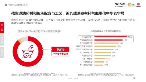 调研数据显示,近九成的消费者倾向中华老字号品牌的增补气血药用滋补品。究其原因,有一半的受访者认为中华老字号品牌药材品质更好,超四成的受访者看重其传承配方及工艺。诸如东阿阿胶、同仁堂、九芝堂等老字号品牌均上榜消费者心目中的TOP级品牌。中华老字号品牌掀起“国潮”养生热,这是气血健康消费的趋势之一。