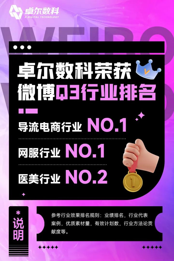 喜讯,卓尔数科作为微博的核心代理商,荣获了微博Q3季度行业排名导流电商行业第一,排名网服行业第一,医美行业第二!