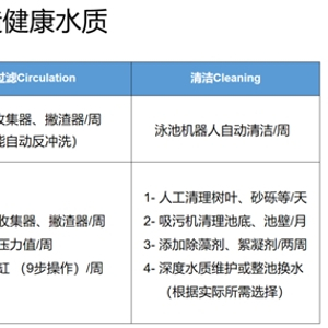 “更智能的泳池系统维护,更健康的水质享受”,长久以来都被泳池业主认为是泳池水质的维护真理。部分别墅泳池业主,为了想用更好的泳池水质体验,专门设计了一套“3C”口诀,牢记泳池维护的相关步骤:Chemistry消毒杀菌,杀灭泳池细菌、病毒;Circulation循环过滤,带动池水循环进入过滤系统,让健康干净的泳池水均匀地分布到泳池中;Cleaning清洁,深度清除池底池壁的落叶、砂砾、碎屑等。