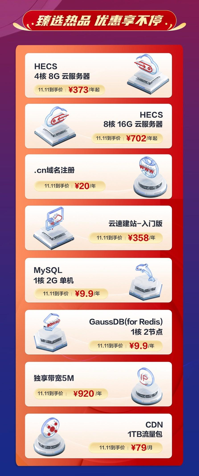 比如云服务器等热销爆款单品,在双11期间会以非常实惠的价格提供给企业用户。其中,可帮助用户打造安全高效的应用环境的通用入门型T6云服务器,2核、2G、4M带宽配置在双11期间到手价仅需49元/年;对于云上开发必选的HECS云耀云服务器,1核、2G、 1M带宽配置仅需35元/年,2核、4G、2M带宽仅需116元,买1个月赠1年;通用计算型S3云服务器(香港)双11到手价仅需108元起,更可享受买1个月赠1年的超值特惠;.com域名注册服务在双11期间到手价每年仅需29元。