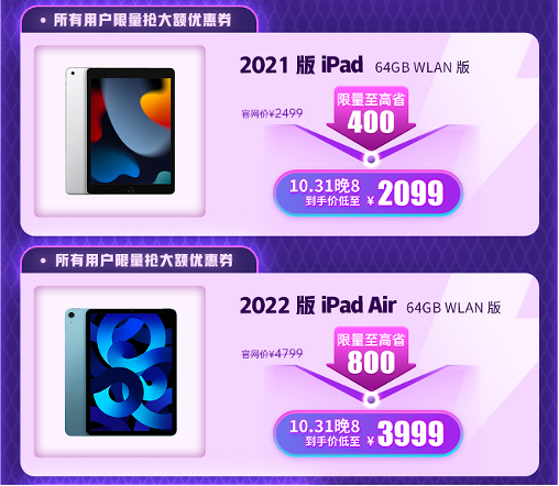 关注iPad的朋友,同样推荐选择前往Apple产品京东自营旗舰店下单。10月31日晚8点,2021版iPad 领券直降400元,64G无线局域网版本到手价2099元,2022版iPad Air领券直降800元,64G无线局域网版本到手价3999元,年度好价值得入手。