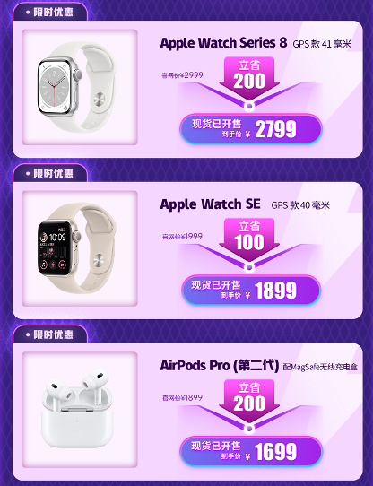 想要购买Apple手表和耳机的朋友也可以打开京东准备下单了。Apple Watch Series 8 GPS款41毫米版本限时立省200元,到手价2799元;Apple Watch SE GPS款40毫米限时立省100元,到手价1899元;AirPods Pro第二代到手仅需1699元,全部现货开售,现在可以直接冲。