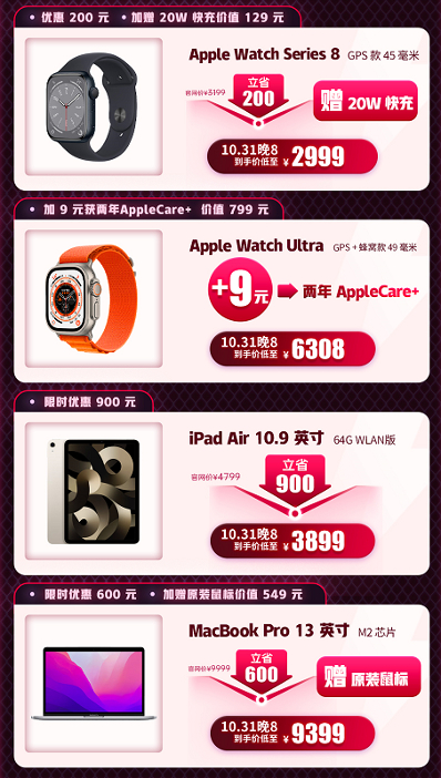 此外,消费者开通Apple产品京东自营旗舰店A+会员,10月31日晚8点还可解锁更多福利,购买iPhone 14系列限量送一年AppleCare+、购买Apple Watch Series 8 GPS款45毫米版本到手价2999元,还可加赠价值129元得20W快充、指定型号Apple Watch Ultra加9元可得价值799元的两年期AppleCare+,更有10.9英寸iPad Air、13英寸MacBook Pro专享好价与赠品,优惠超实在、购机超省钱。