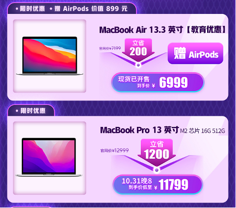 针对MacBook产品,Apple产品京东自营旗舰店同样准备了超值好价。MacBook Air 13.3英寸教育优惠版本京东下单立省200元,到手价6999元,还限量加赠价值899元的AirPods,现货已开售,现在就可以下单购买。MacBook Pro 13英寸M2芯片 16+512G版本,Apple产品京东自营旗舰店下单立省1200元,10月31日晚8点到手价11799元,准备焕新笔记本电脑的朋友记得定好闹钟。
