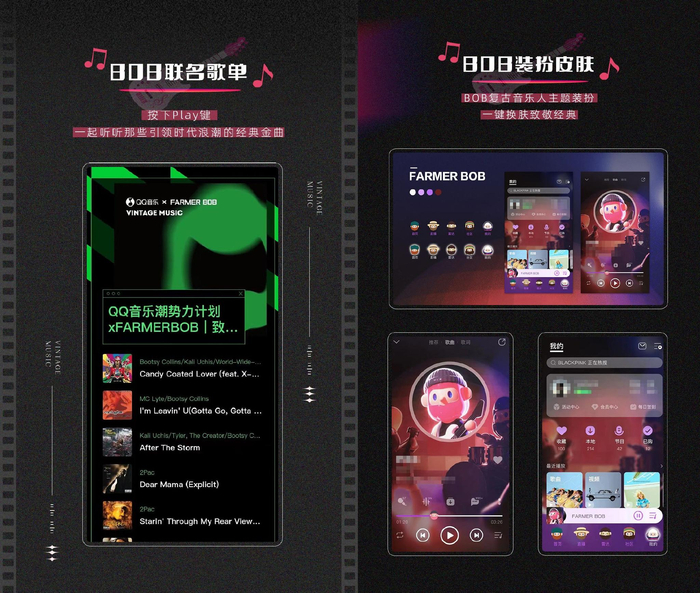 与「复古音乐」联名礼盒一起推出的,还有一张名为“QQ音乐潮势力计划xFARMER BOB | 致敬复古音乐”的BOB专属歌单以及BOB主题的专属皮肤。歌单中重现了那些穿透时空的经典歌曲,并以此向鲍勃迪伦、大卫鲍伊、皇后乐队、披头士等那些乐坛黄金时代的音乐巨星们致敬。用户可以在尽享潮流复古音乐的同时,获得多重个性玩法和潮酷体验。