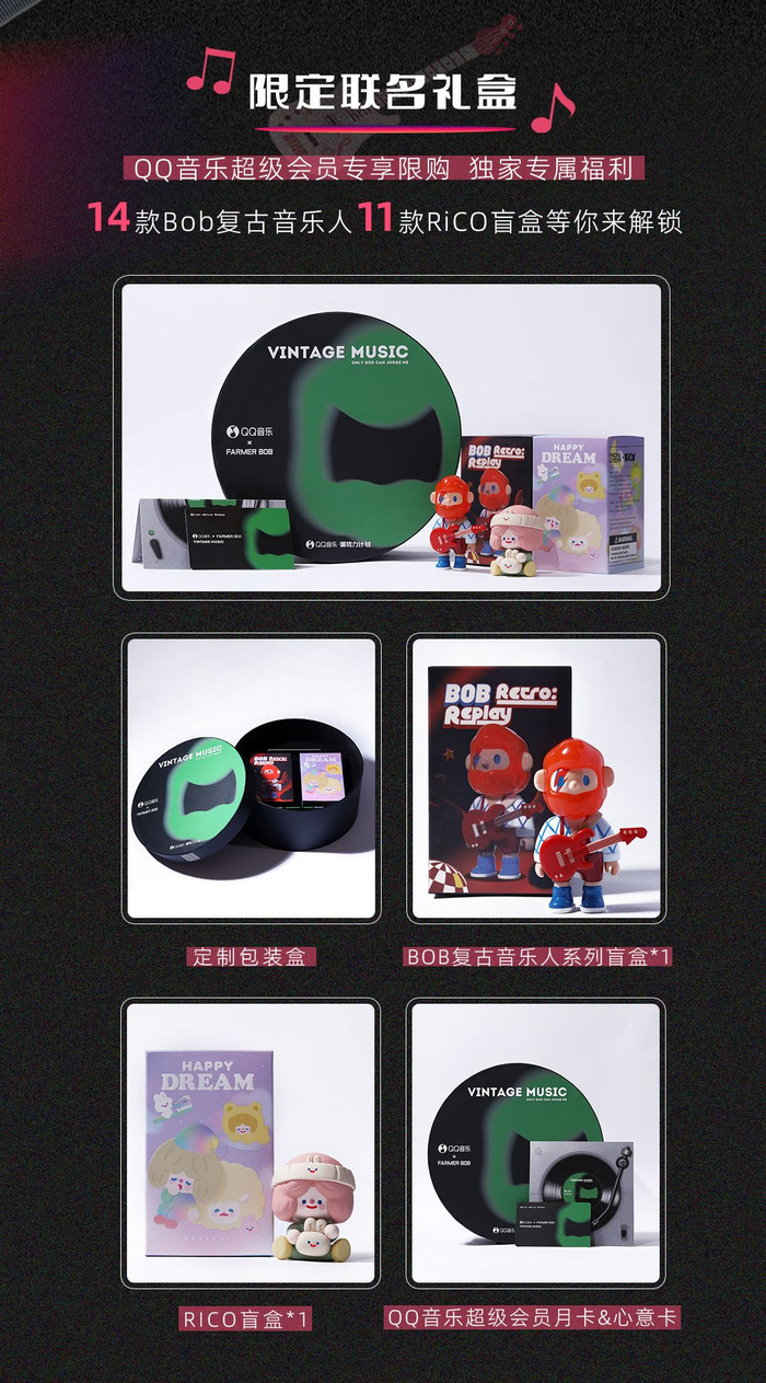 “潮”领域又现“神联名”!近日,QQ音乐“潮势力计划”联合潮玩“顶流”FARMER BOB打造「致敬复古音乐」跨界企划,以联名潮玩礼盒、主题皮肤、联名歌单及线下潮流展打造多元体验,致敬音乐史上的传奇巨星以及他们影响时代的创新精神。限定联名礼盒中,包含1份BOB复古音乐人盲盒、1份RICO盲盒、一张特别订制的QQ音乐超级会员实体卡,以及一张专属心意卡,潮感十足,情怀满满。目前,该联名礼盒已在QQ音乐面向超级会员限量发售。两个品牌以“潮”为名进行的此次合作,是一场复古与潮流的创意跨界,让乐迷在潮流之乐和潮玩艺术的火光碰撞中,激荡出新的音乐之美,灵感之光。