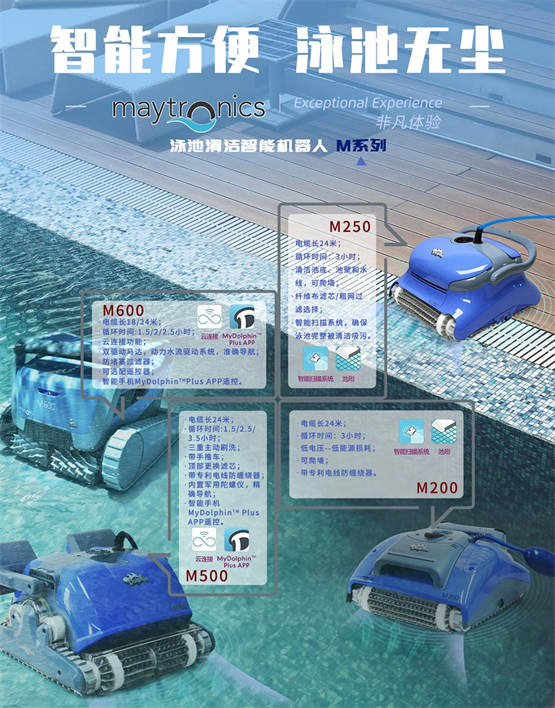如今泳池清洁机器人的出现,正在全面简化泳池清洁步骤,让清扫变得更便捷化、高效化、智能化。以Maytronics海豚泳池吸污机为例,只需要放入水中,一键启动,就会全自动开始智能导航,彻底清扫泳池中的沙粒、淤泥、树叶、藻类以及污垢等,省心省力。