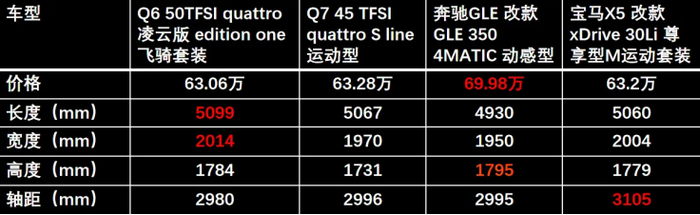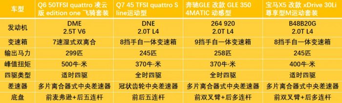 遵循价格相近原则,笔者选取了上汽奥迪汽车Q6、华晨宝马X5、一汽奥迪Q7、进口奔驰GLE贴近的车型配置(如下图)。