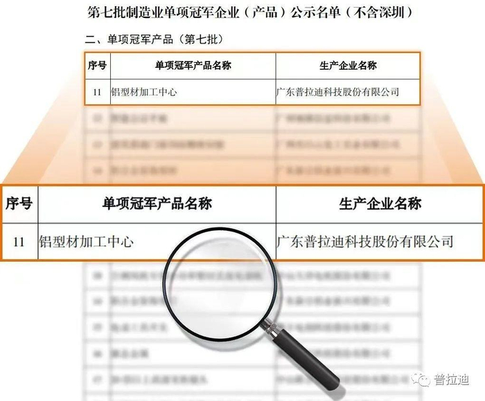 此外,近日,广东省工信厅发布了《关于广东省第七批国家级制造业单项冠军企业(产品)和第一批、第四批国家级制造业单项冠军企业(产品)复核通过名单》。普拉迪的铝型材加工中心入选了工信部、中国工业联合会组织评选的第七批国家级制造业单项冠军企业(产品)名单 。