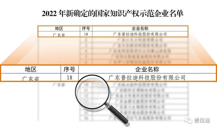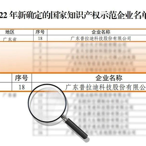 经企业申报、各地方知识产权部门组织测评、推荐,国家知识产权审核,并向社会公示,广东普拉迪科技股份有限公司凭借持续创造高价值专利,扩宽专利护城河,突出的知识产权创造、运用、保护和管理能力,被评定为“2022年度国家知识产权示范企业” 。
