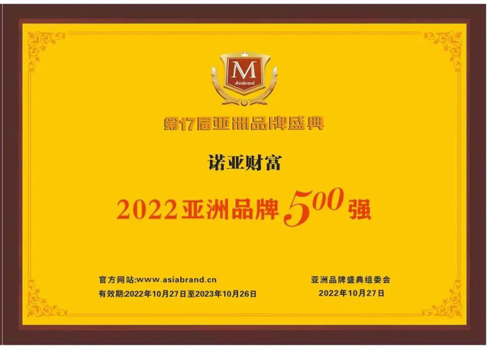 诺亚财富作为榜单内中国首家在纽交所以及港交所两地上市的独立财富管理机构,凭借近20年在财富管理行业持续深耕的综合实力和品牌专业的持续认可,入围亚洲品牌500强榜单并获得两项特别奖项,与亚洲500强品牌一同见证中国品牌影响力。