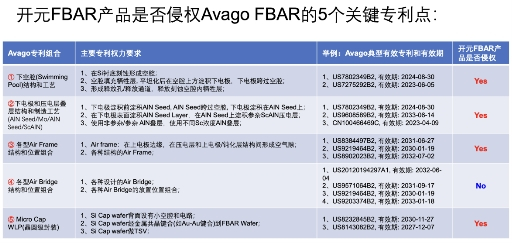 另有一份专利鉴定报告显示,开元通信FBAR产品在至少4个关键专利点上对Avago公司专利构成侵权,包括下空腔(Swimming Pool)结构和工艺、各型Air Frame 结构和位置组合、下电极和压电层叠 层结构和制造工艺、Micro Cap WLP(晶圆级封装)等。(小K注:Avago即安高华科技,2015年以170亿美元现金和价值200亿美元的股票收购博通)