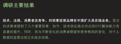 也因为越来越多的企业开始执行DTC战略,2022年3月国际咨询公司Forrester发布了《中国市场DTC业务发展专题》报告,报告中认为因为技术、法规、消费者需求、竞争四个因素促使品牌在中国市场扩大其DTC业务。