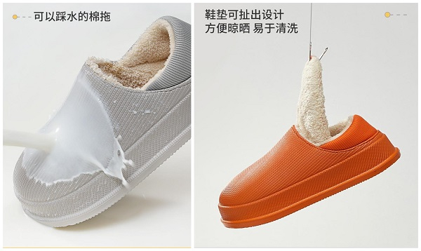 现市面上很多棉拖鞋都是毛茸茸的外形,沾水粘上污渍了打理起来很麻烦;穿的时间久了,棉拖鞋的内里会出现不同程度的发臭发黑,冬天清理起来费力又不容易干,如果不及时清洗,温暖、潮湿的棉拖鞋将成为细菌繁殖和繁殖的聚集地,长期穿着会导致脚臭、脚癣和其他疾病发生。优调对此设计出了易打理的防溅水鞋面和便清洗的可抽拉鞋垫,洗棉拖鞋既快捷又省时省力,解决了棉拖鞋清洗的难题。