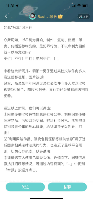 一直以来,不良低俗内容就像互联网上的“牛皮癣”,影响人们的互联网使用体验。为了给广大用户打造绿色清朗的社交环境,Soul开展了不良低俗内容专项整治,从内容广场、文字群组、群聊派对等多个产品场景进行集中优化治理。