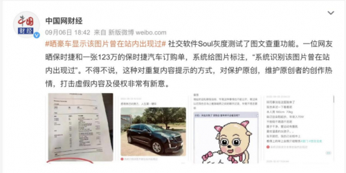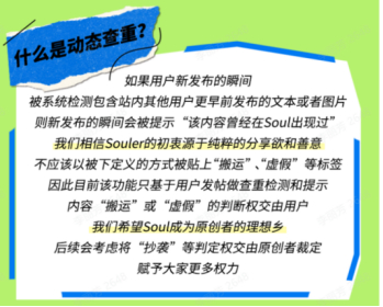 在平台发展中,Soul一直将“真实”作为倡导鼓励的平台氛围和社交礼仪。为给用户带来更多有趣、多元、温暖、真实的社交体验,保护原创者的作品和著作权,Soul开启了国内社交平台的动态查重先例,上线了查重识别模型——比对站内历史发帖,识别并标记来自不同用户的雷同内容。例如,如果发布者的图片曾经在站内内容广场出现过,在其个人主页对应的内容帖下方将出现该内容曾在站内出现过的提示。此前,一位网友在Soul上晒豪车和一张123万的汽车订购单,而通过查重识别,该图片被自动标注“系统识别该图片曾在站内出现过”,此事在互联网引起热议。通过启动动态查重等举措,Soul不仅保护了原创作者的权益,也强化对跟风博眼球等内容的打击。同时,此举能够有效打击虚假人设,有助于防范网络诈骗。