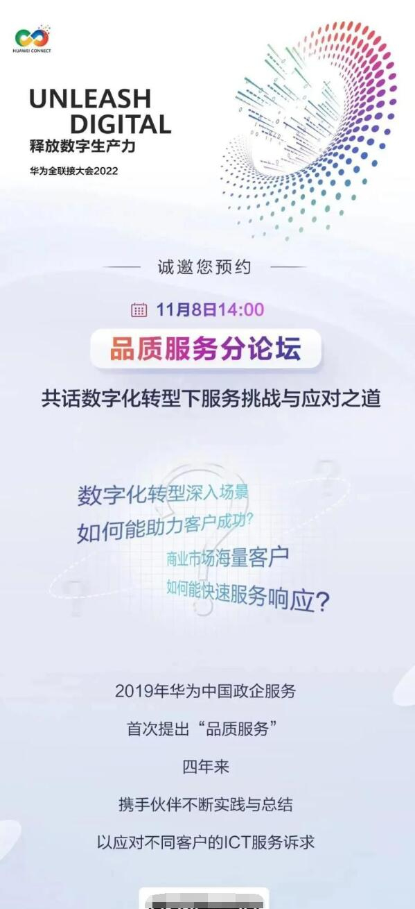 华为全联接大会2022期间,诚邀您预约11月8日14:00“品质服务分论坛”,华为将带来更多面向政企客户服务需求的应对之道。