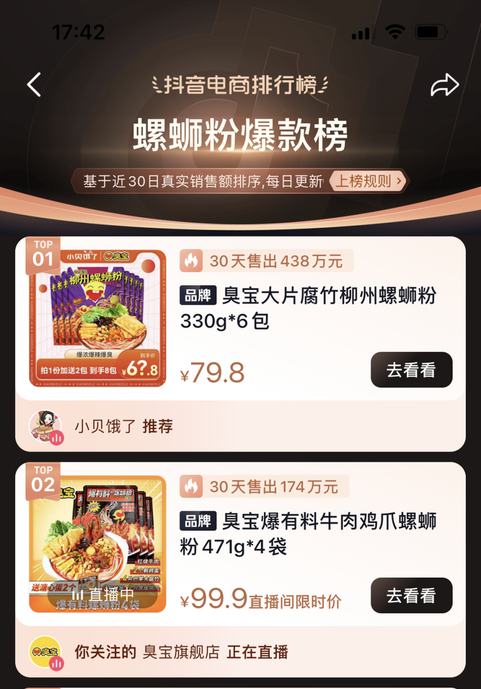 在国内,臭宝螺蛳粉早已凭借着满足消费者高标准需求的能力,实现了销量与口碑的双赢。截止9月28日,臭宝大片腐竹柳州螺蛳粉和臭宝爆有料牛肉鸡爪螺蛳粉两款产品,成功包揽抖音官方发布的《螺蛳粉爆款榜》榜单前二名。7月,臭宝爆有料柳州螺蛳粉、臭宝沸沸原汤柳州螺蛳粉、臭宝爆爆浓汤柳州螺蛳粉三款产品获得被誉为“电商界奥斯卡”的金麦奖。