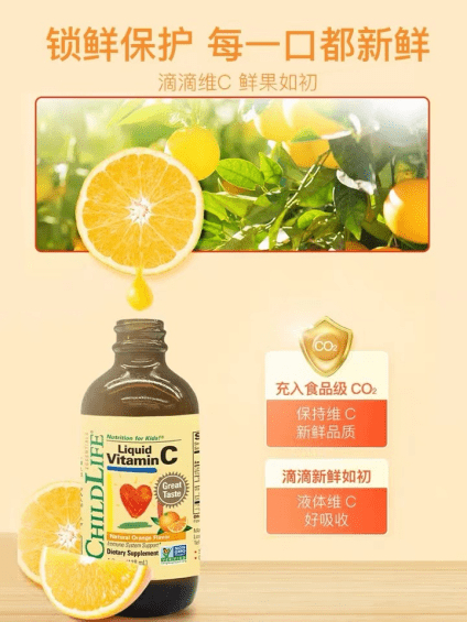 ChildLife维C营养液优选来自“阳光梦工厂”的加州鲜橙,每一颗橙子都晒足3000个小时,保证了更高含量的维C提取,1勺5ml维C营养液约等于6个鲜橙维C含量。同时,ChildLife采用独特营养锁鲜技术,让每一滴营养都能锁住最初的鲜美口感。