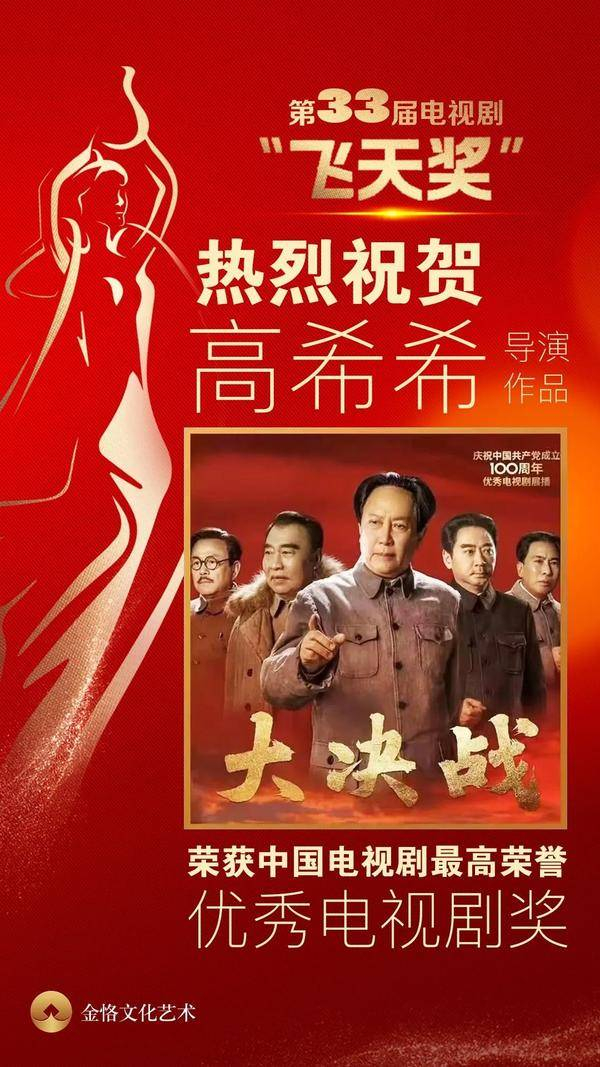 2022年11月1日,第33届电视剧“飞天奖”获奖名单隆重揭晓,金恪文化艺术董事长、中国著名导演高希希导演作品《大决战》荣获优秀电视剧奖。