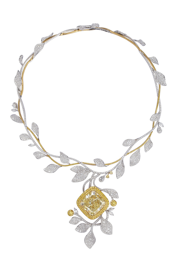 此次发布的高级珠宝作品中,最引人瞩目的明星当属一枚重达50.19ct的垫形切割黄钻The Queen of Moon。MONETA以双生花概念挥洒笔触,推出两款设计来诠释这件珍宝。由女性的优雅魅力出发,分别从月桂花环与蕾丝缎带中汲取灵感创作,勾绘一道华丽又浪漫的绝美风景。数颗晶莹美钻凝结成月桂叶的形状,片片缠绕于枝蔓之上,编织成寓意胜利荣誉与甜蜜爱情的精致花环,众星捧月般托起温暖耀眼的主石,女性的典雅曼妙之美得到极致展现。另一款设计以颗颗高品质白钻与黄钻排布镶嵌,幻化为一条轻盈飘逸的蕾丝缎带,与主石的明艳大气形成反差碰撞,尽显大女主姿态之下的温柔甜美底色。