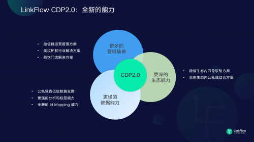 更深的生态能力。前文中有提到,国内互联网生态下有多种不同的生态,且这些生态都有各自特点。LinkFlow CDP 2.0针对这些生态各自的特点会推出相应的解决方案,提供对应的能力。例如我们会在微信体系内会针对视频号提供视频号和微信公众号、企业微信、小程序四号联动的完整营销解决方案。此外,也会提供比如在京东生态内的全域营销能力和方案,诸如此类等等。