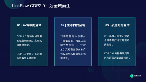 LinkFlow CDP 2.0的定位就是为全域而生。从LinkFlow的角度来说,全域有三个层次的意义: