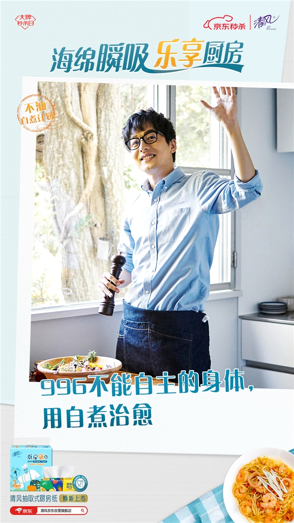 为此,清风推出“不油自煮计划”, 以焕新上市的清风海绵吸厨房纸巾为依托,用“一抹即净”的不油体验和“一扫就会”的自煮攻略,帮助用户破除厨房恐惧,给不同身份的用户轻松自煮不油腻的厨房体验,让TA们能不由自主地爱上烹饪,轻松享受做饭带来的快乐。