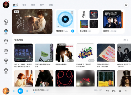 打开iPad进入酷狗音乐HD,首页丰富的歌曲、歌单个性化推荐,让用户总能发现心动的好音乐。新歌推荐、排行榜、精选专题内容实时更新,歌单专属推荐、猜你喜欢、每日推荐量身定制,还有睡前推荐、运动必备、K歌必唱等音乐专区,每天都有听不完的宝藏内容。
