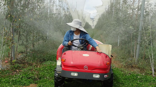 10月底,记者来到位于凉山州盐源县龙塘镇上海村1200亩的古柏农业园区内,看到了一期和二期不同的劳动场景。园区一期防雹网下种植三年多的苹果丰收了,红彤彤的苹果散发着诱人的香味,果农们有条不紊地进行采摘、分拣、装筐等一系列作业,载满苹果的三轮车在苹果林间穿梭,一派忙碌的景象;而园区另一侧二期种植的苹果幼苗林间,有一个工人驾驶着轮式弥雾机在为苹果幼苗喷洒防治病虫害水雾剂。除此之外,园区引进的智能水肥一体化、虫情测报系统、气象检测站等智能化新技术,各种高科技智慧农业设施让人仿佛置身于一个漂亮整洁的“农业工厂”。