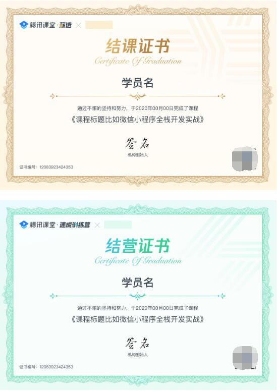 对于达到一定完课率的用户,腾讯课堂还将与机构联名颁发统一的结课/结营证书。
